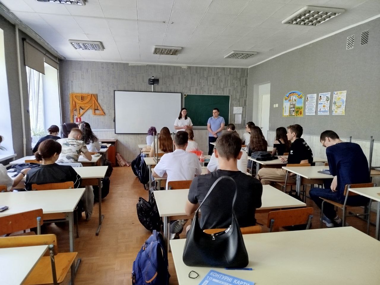 Зі школярами зустрілися начальниця відділу міжнародних зв’язків, викладачка кафедри іноземної філології, перекладу та методики навчання Валентина Крикун, доцент кафедри іноземної філології, перекладу та методики навчання Олеся Скляренко, завідувач кафедри цифрових технологій навчання Олександр Васенко та викладач кафедри цифрових технологій навчання Віталій Крикун.