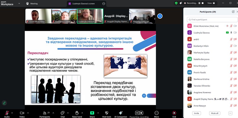 Кафедрою іноземної філології, перекладу та методики навчання факультету української та іноземної філології Університету Григорія Сковороди в Переяславі була організована відкрита онлайн-лекція на тему: «Переклад як засіб культурного посередництва: відтворення реалій». Лектором виступила висококваліфікована фахівчиня, докторка філологічних наук, професорка кафедри теорії і практики перекладу з англійської мови Навчально-наукового інституту філології Київського національного університету імені Тараса Шевченка Людмила Славова.
