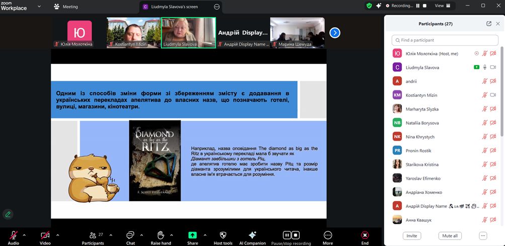 На платформі «Zoom» до заходу долучилися науково-педагогічні працівники кафедри та здобувачі ОПП «Германські мови та літератури (переклад включно), перша – англійська». Також була присутня гарант ОПП «Германські мови та літератури (переклад включно), перша – англійська» першого (бакалаврського) рівня вищої освіти, доктор філософії, доцент кафедри іноземної філології, перекладу та методики навчання Університету Григорія Сковороди в Переяславі Юлія Молоткіна.