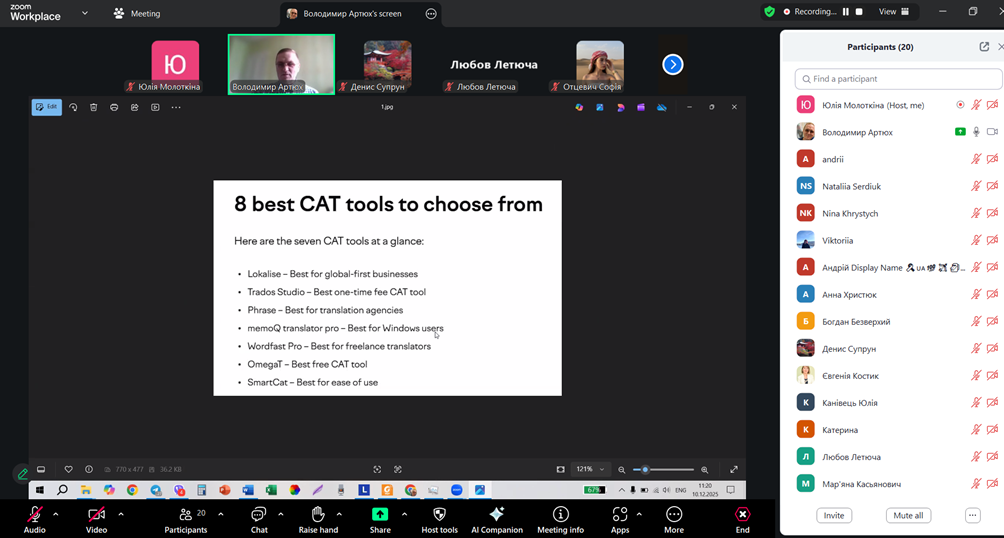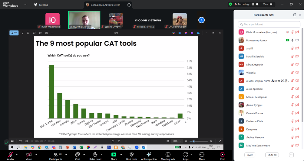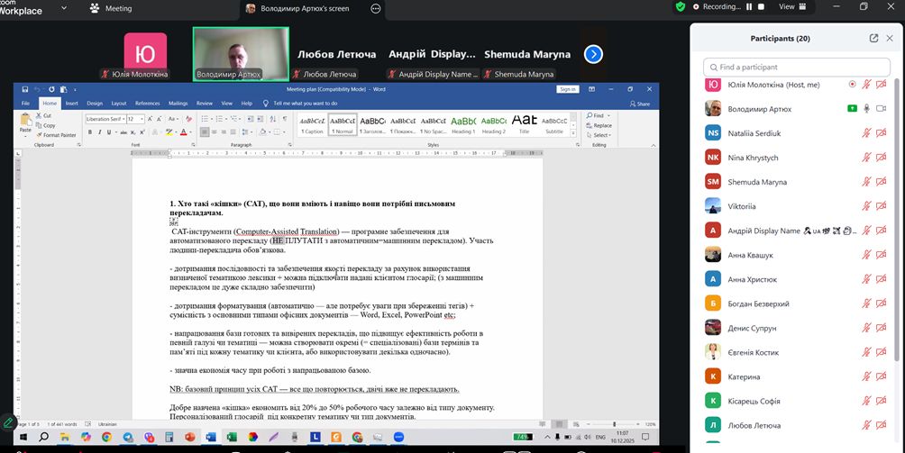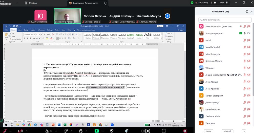 Саме використання технологій перекладу за допомогою комп’ютера (САТ) стало ключовою темою майстер-класу. Володимир Артюх детально представив концепцію та функціонал САТ-інструментів, пояснивши їхню необхідність для сучасних письмових перекладачів. Він окреслив сфери, де застосування цих інструментів є критично важливим для оптимізації роботи, а також випадки, коли їхня потреба не є настільки високою.