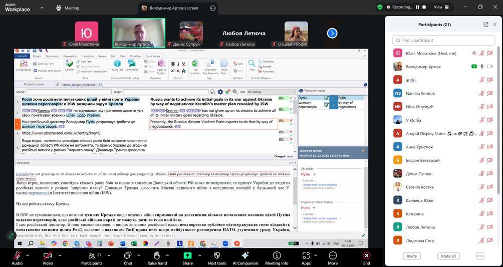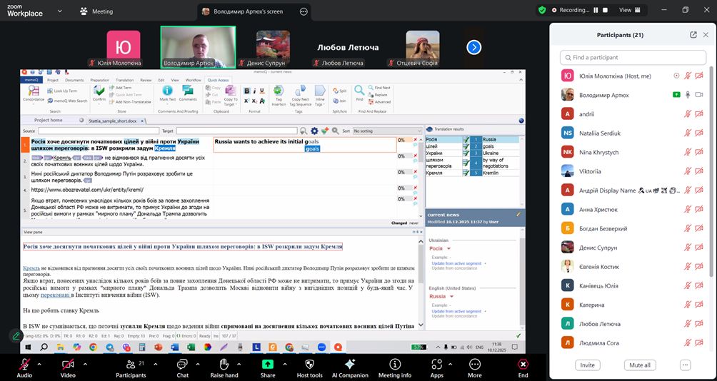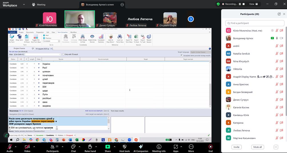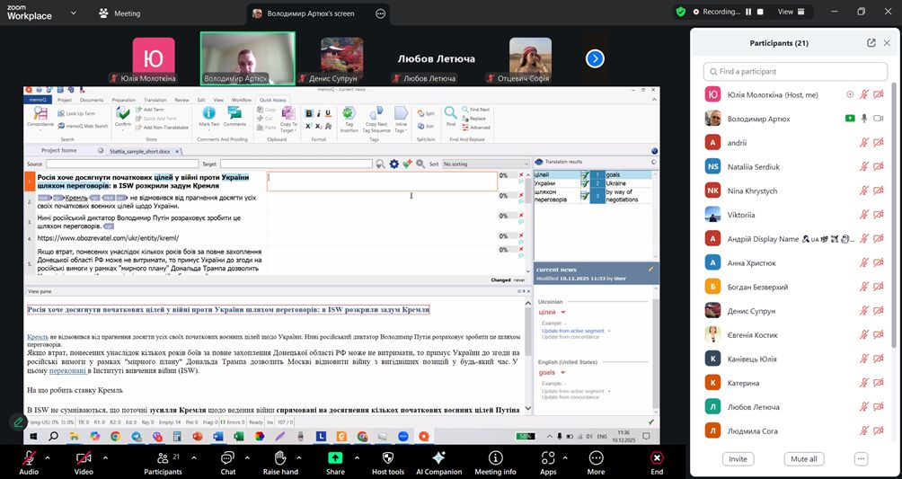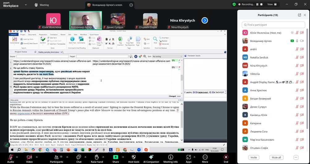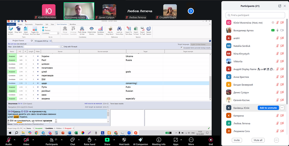 Практична частина заходу включала демонстрацію роботи у середовищі MemoQ. Учасники ознайомилися з покроковим процесом створення перекладацького проєкту «з нуля» та виконання перекладу нового документа. Спікер продемонстрував можливості налаштованого САТ-інструменту та показав алгоритм роботи з ним, а також висвітлив розширений функціонал та додаткові можливості, доступні користувачам.