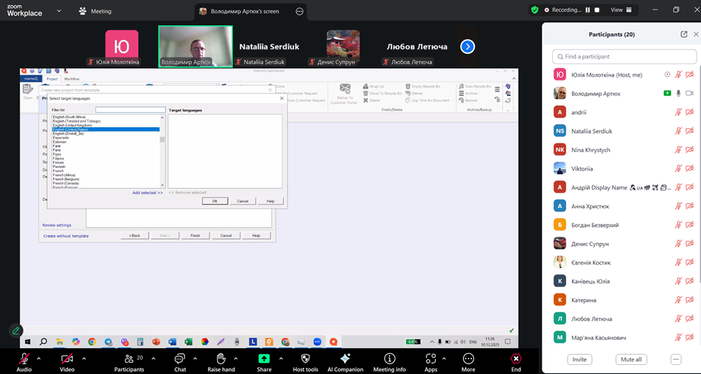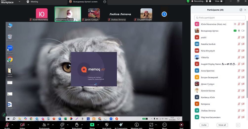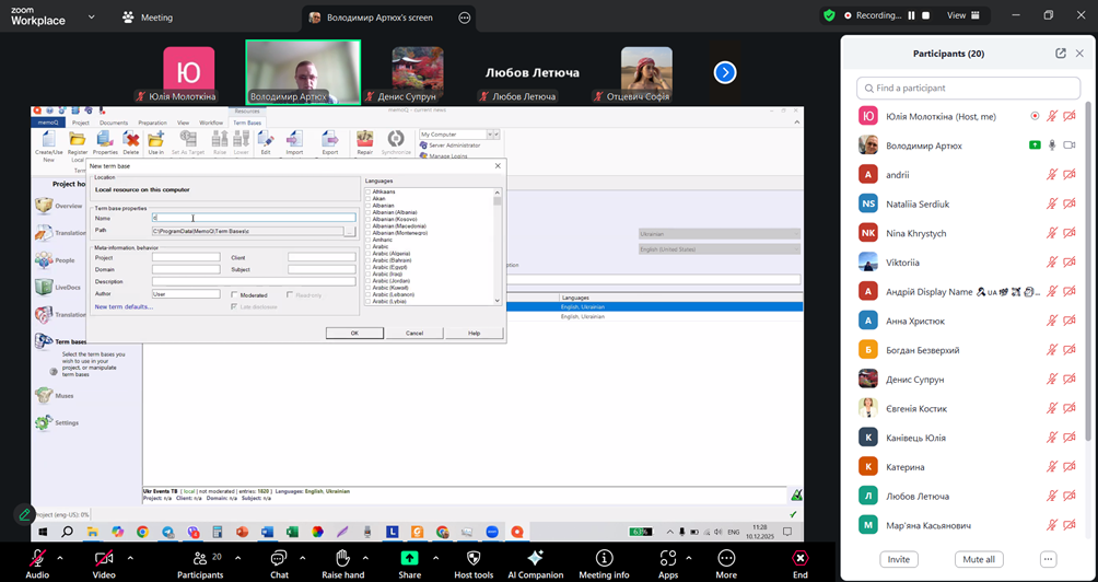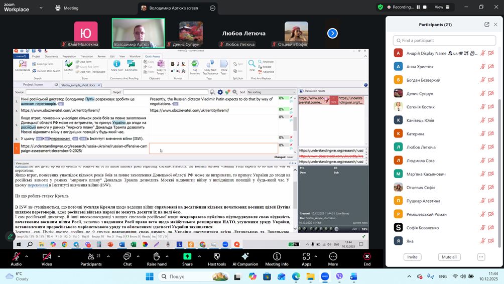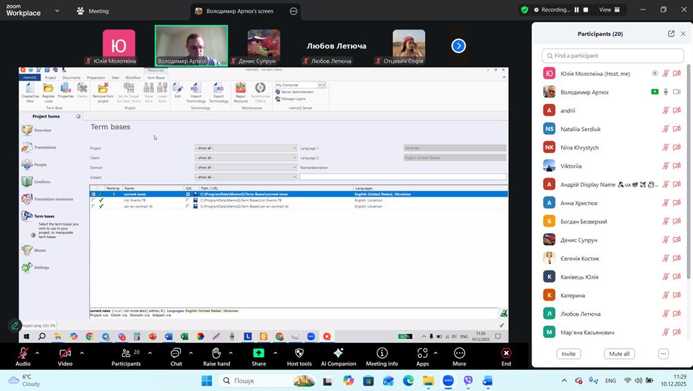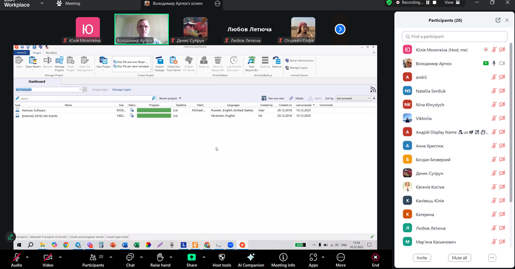 Практична частина заходу включала демонстрацію роботи у середовищі MemoQ. Учасники ознайомилися з покроковим процесом створення перекладацького проєкту «з нуля» та виконання перекладу нового документа. Спікер продемонстрував можливості налаштованого САТ-інструменту та показав алгоритм роботи з ним, а також висвітлив розширений функціонал та додаткові можливості, доступні користувачам.