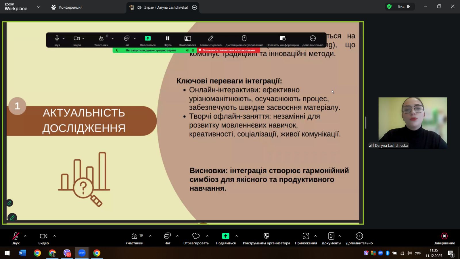 Під час онлайн-захисту панувала доброзичлива атмосфера академічної дискусії, що дала можливість студентам вдало продемонструвати глибоке розуміння обраних тем, аналітичне мислення, вміння аргументовано висловлювати власну позицію та давати чіткі відповіді на запитання, а також здобути цінний досвід публічного виступу.